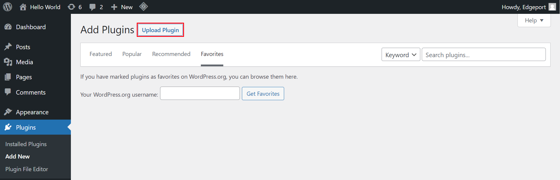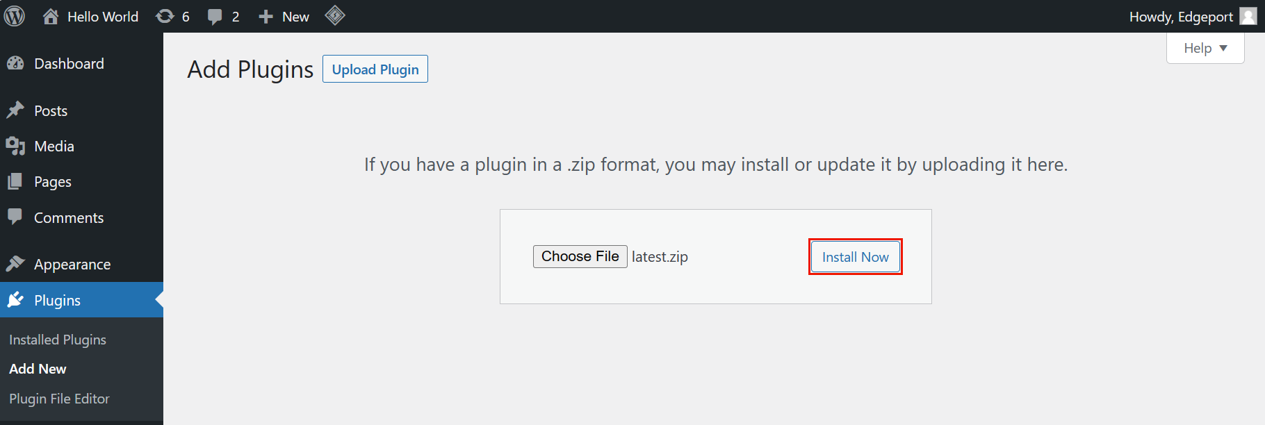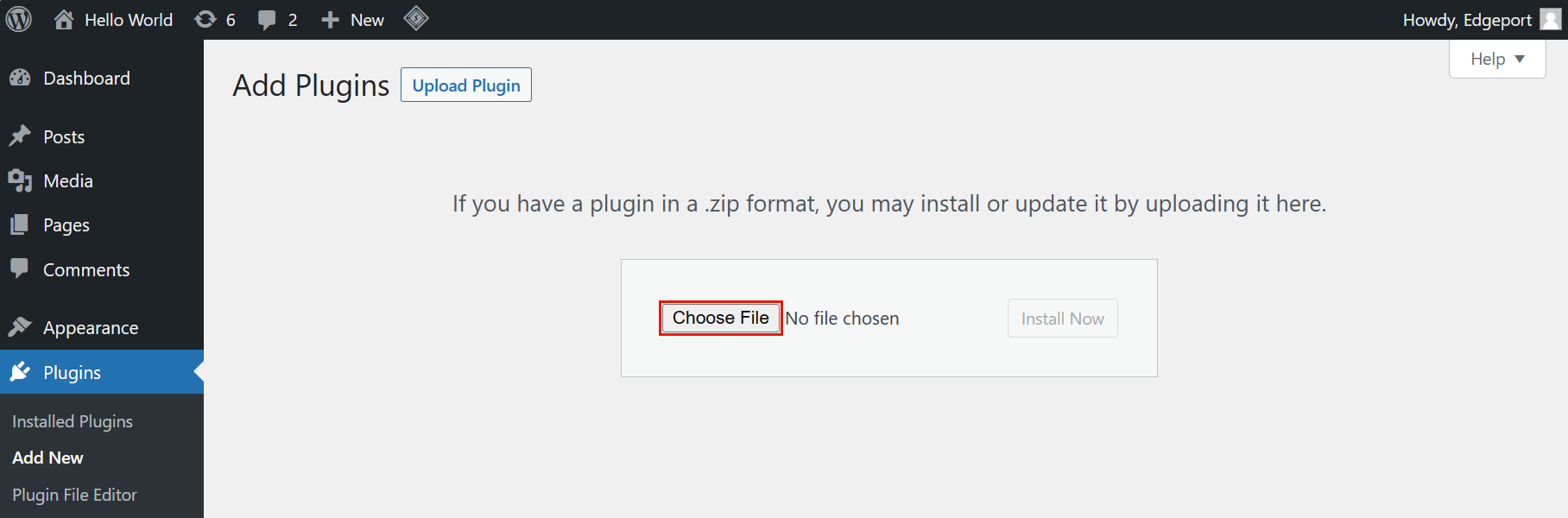 Click on Choose File and locate the archive package you downloaded during the Get the Edgeport WP Plugin Package instruction steps above.