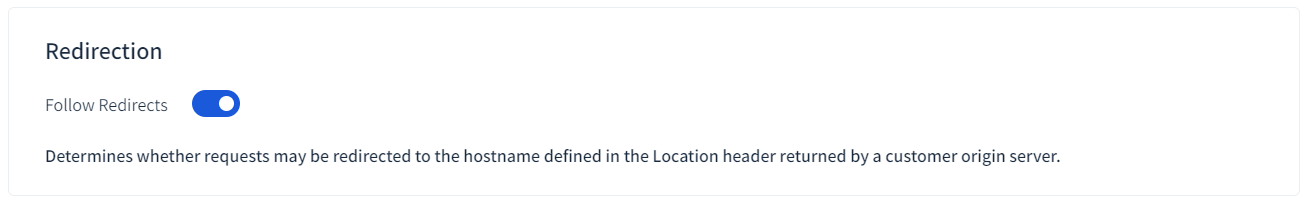 The position of the toggle switch here determines whether the Edge server will honor the URL redirect included in the Location response header, received from your origin server, when evaluating the optimal set of ADN gateway servers for your custom origin configuration.