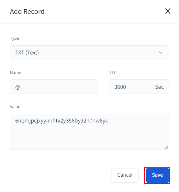 In the displayed pop-up, choose the ***TXT (Text)*** record **Type** and fulfill the rest of the fields as follows: