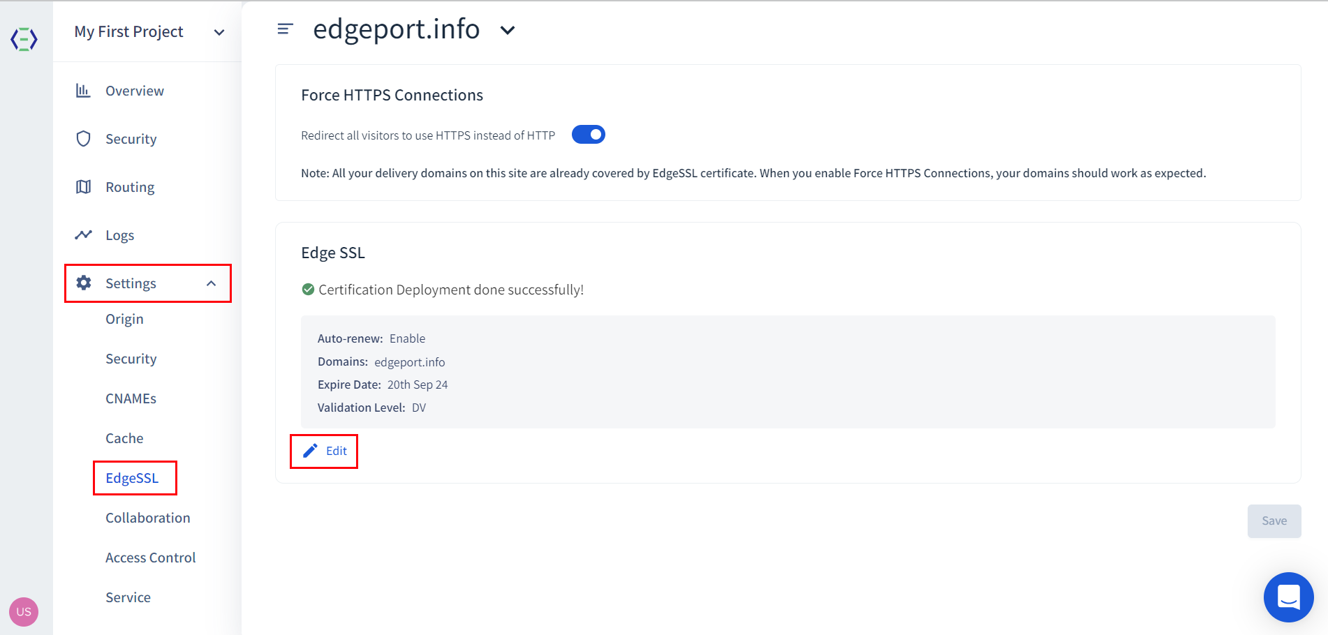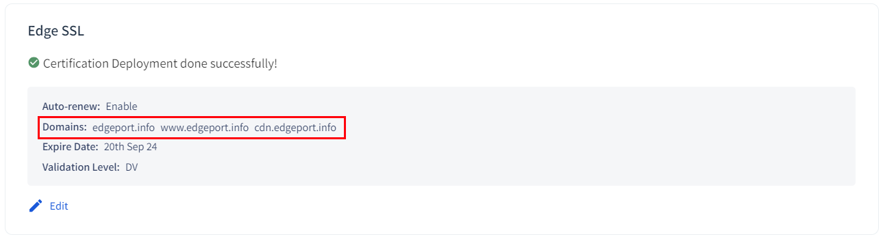 1. To update the domains list, navigate to the corresponding **Settings > EdgeSSL** service menu section and click the ***Edit*** option below the table with the details of your currently active certificate.