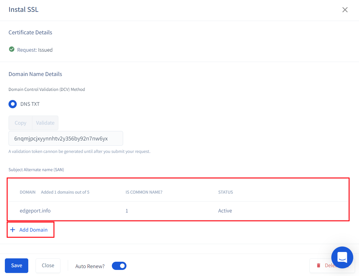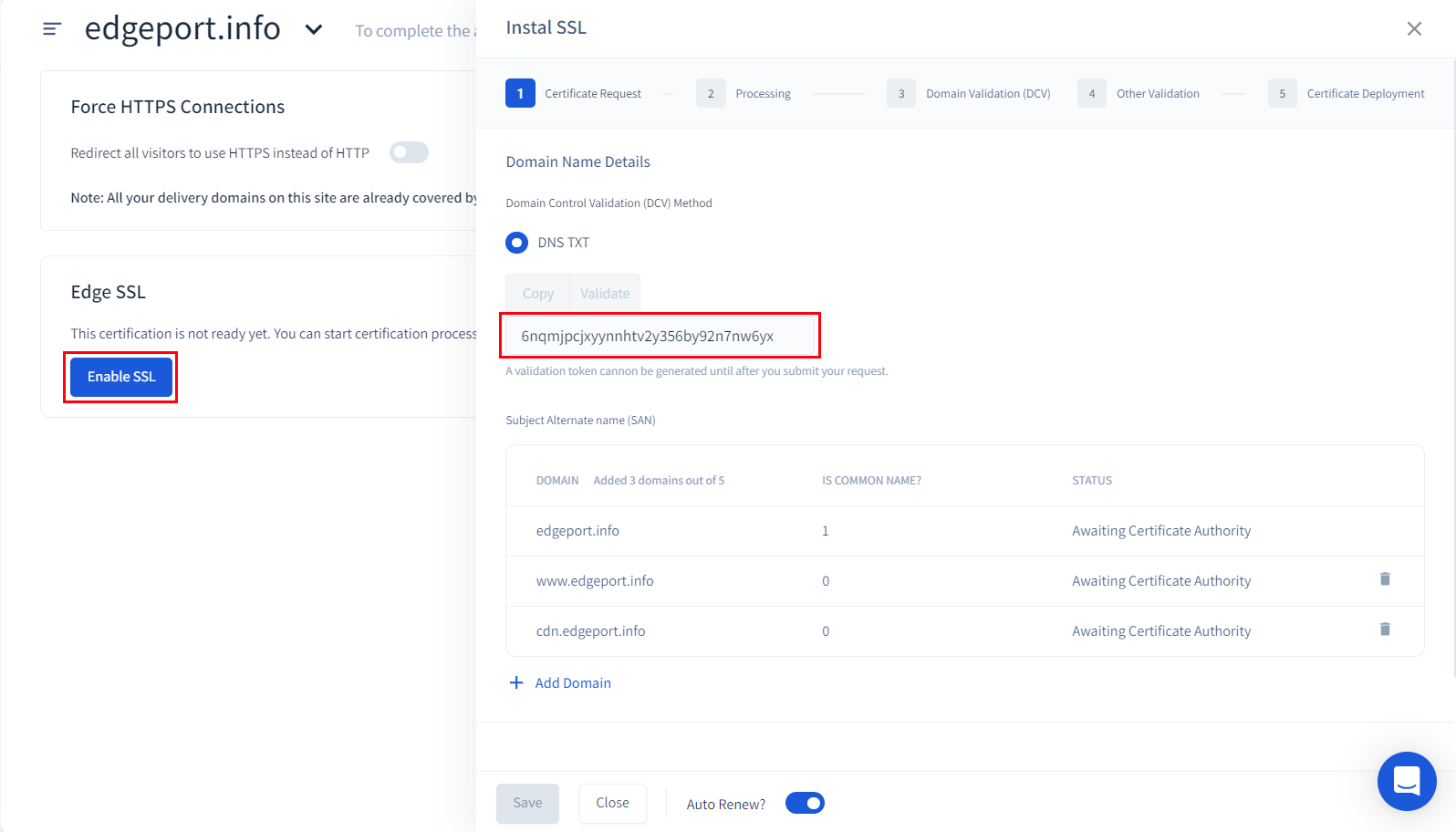 In the ensuing frame, you’ll notice that the status for all your provided domain names has been changed to *Awaiting Certificate Authority*.