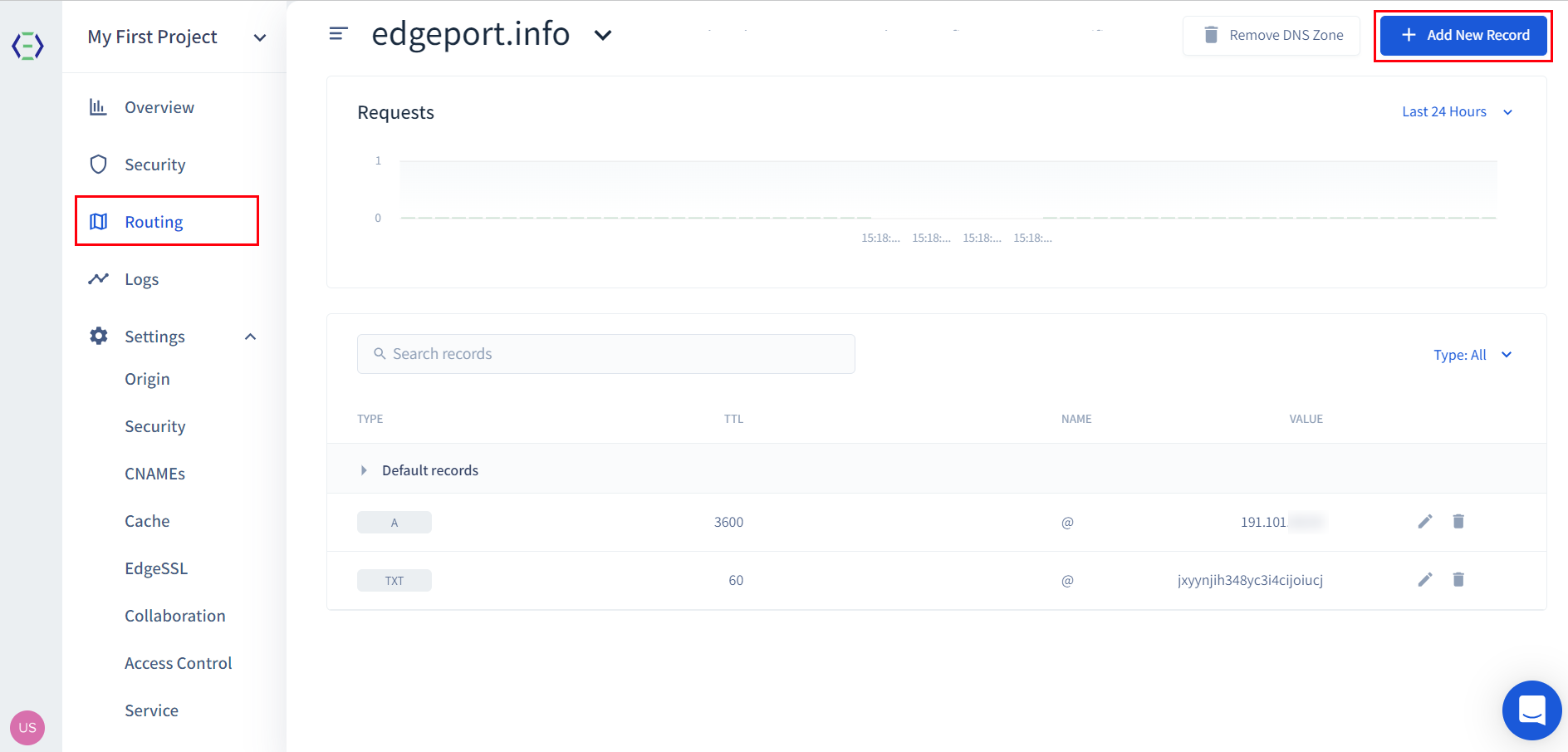If you are using the embedded Edgeport’s DNS Routing solution, navigate to the ***Routing*** menu section to the left and click the **Add New Record** button.