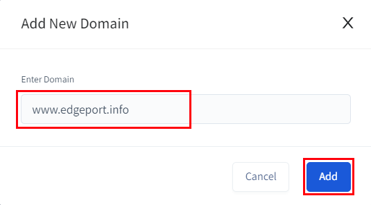 3. Enter the required domain name within the shown pop-up window and click on **Add**.